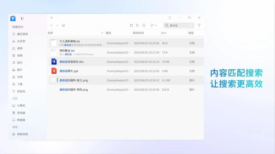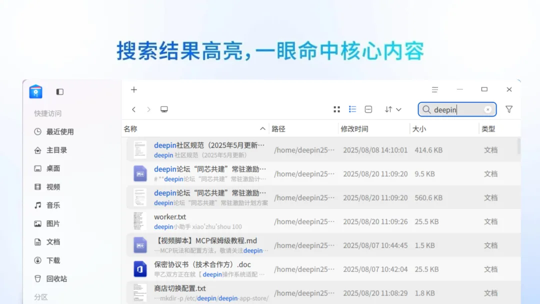 在 deepin 25 的全文检索结果列表中,所有包含关键词的文件名和文件内容都会用醒目的颜色标记,无需逐字阅读就能一眼锁定重点,让信息获取效率提升数倍。