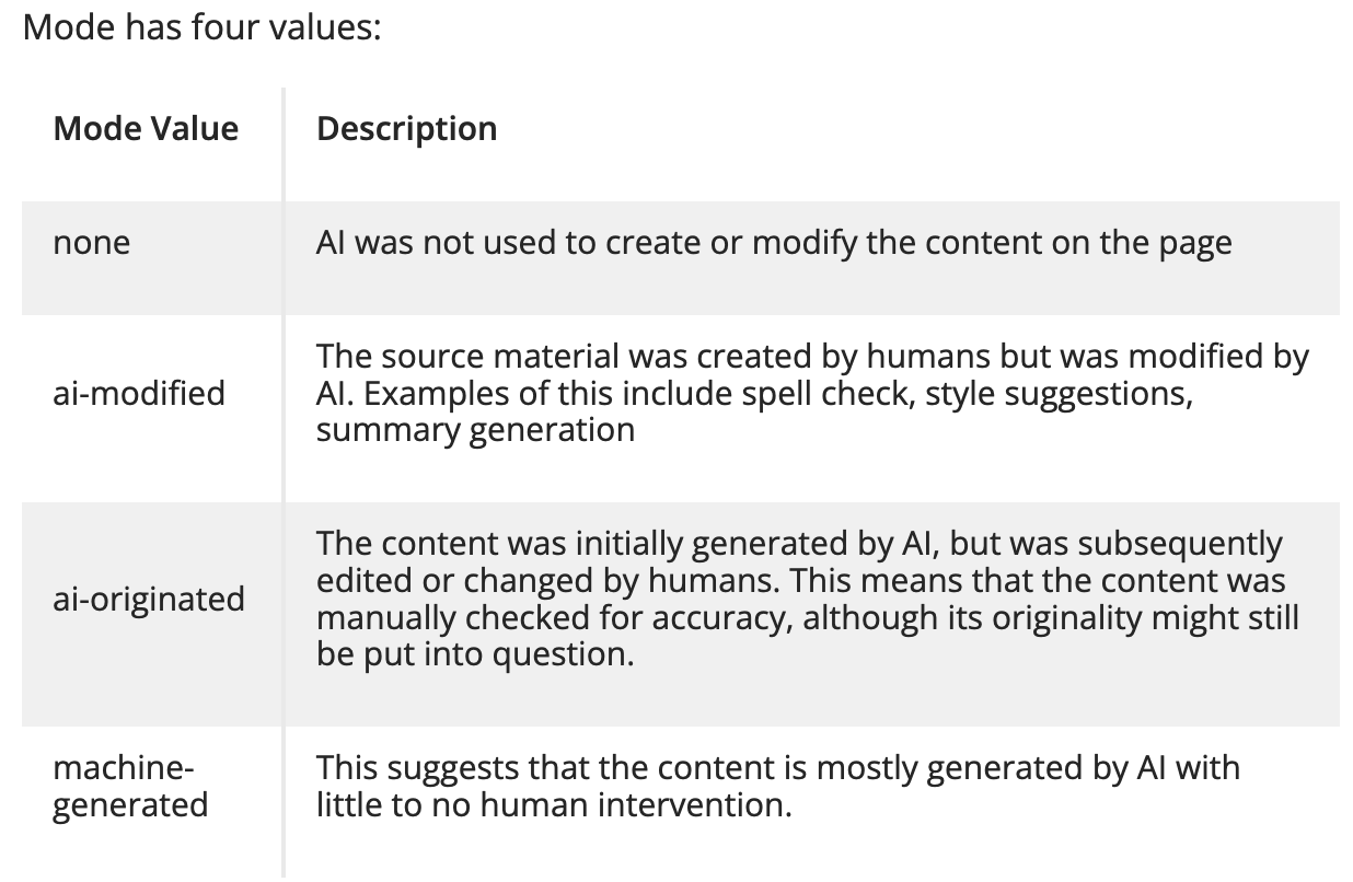其中,mode 有四种取值:none(未使用 AI 生成或修改内容)、ai-modified(原有人类创作,经 AI 修改)、ai-originated(内容由 AI 生成,经人工编辑修改并审核)、machine-generated(几乎完全由 AI 生成,几乎无人为干预)。