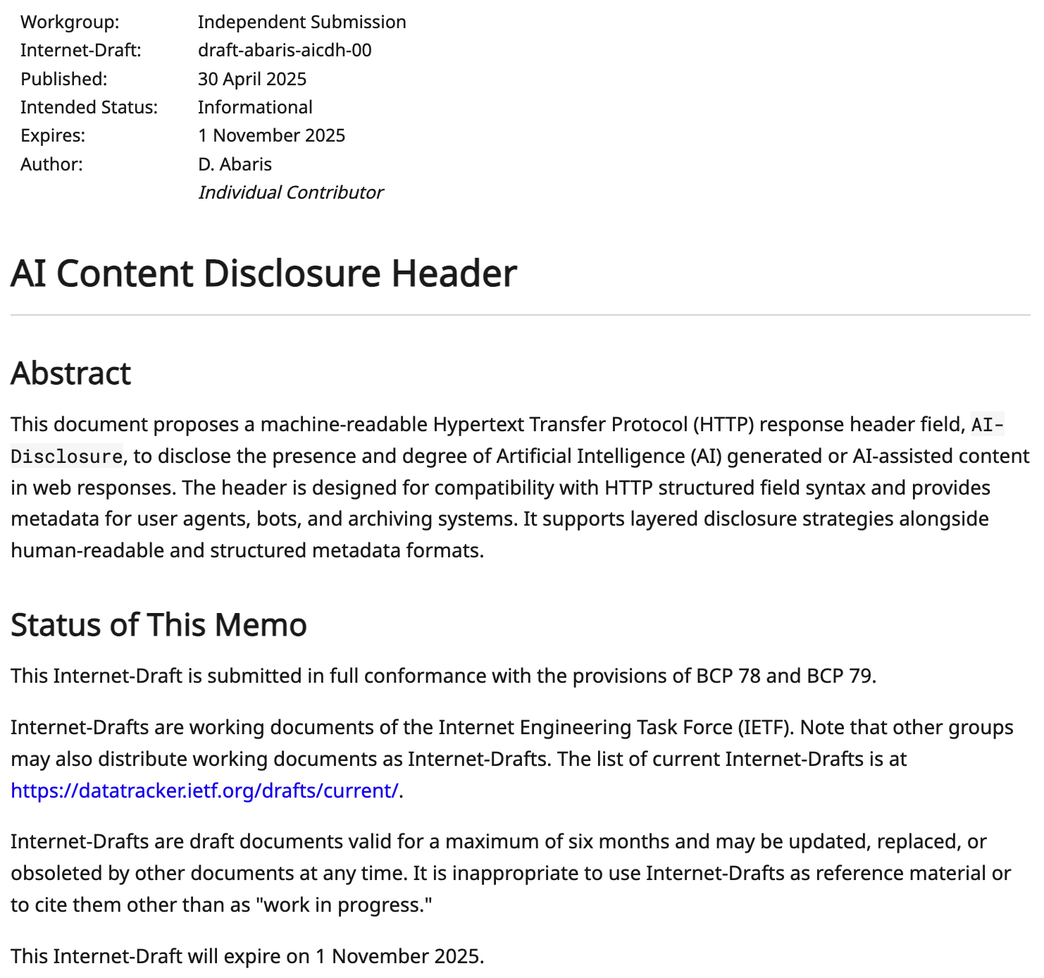 互联网工程任务组(IETF)近日发布《AI 内容披露头字段》(AI Content Disclosure Header)草案,提议在网页 HTTP 响应中新增可机读的 AI 使用标记,以说明 AI 在内容生成中的参与情况。