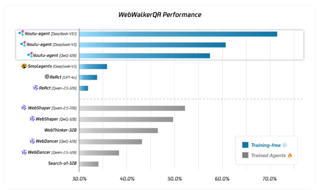 Youtu-agent 的主要特点之一是其经过验证的性能。在 WebWalkerQA 基准测试中,该框架使用 DeepSeek-V3系列模型达到了71.47% 的准确率,而在 GAIA 基准测试中,达到了72.8% 的准确率,显示出开源模型的强大潜力。通过优化框架,Youtu-agent 实现了低成本、便捷的部署,无需依赖封闭模型。