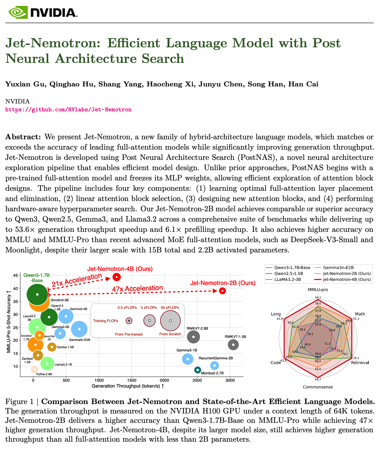 英伟达研究团队发布混合架构语言模型 Jet-Nemotron