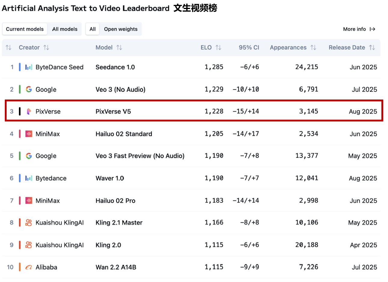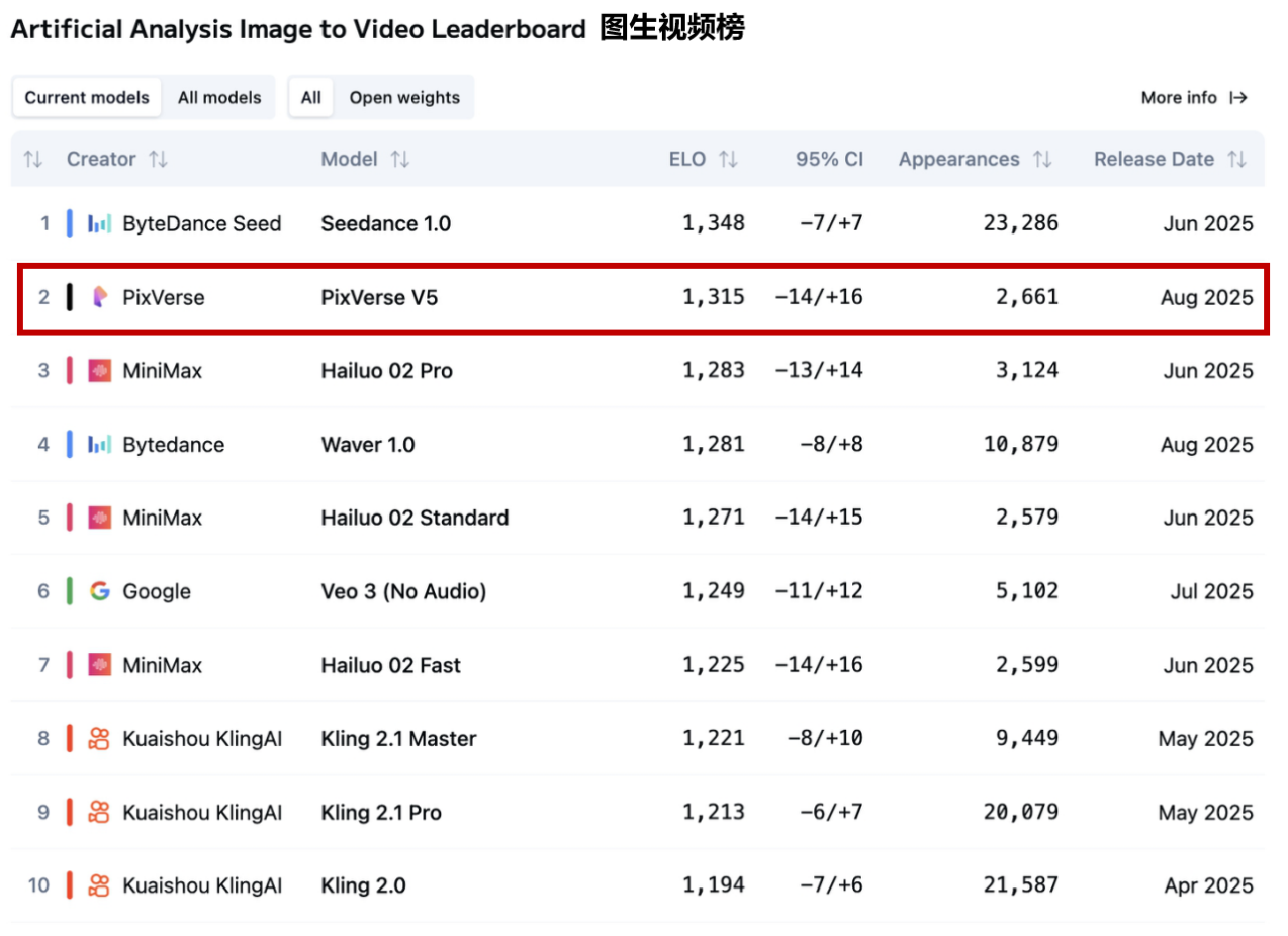 据介绍,基于V5动态效果、视觉质量、一致性保持、指令遵循等方面的综合提升,根据权威独立测评平台 Artificial Analysis 最新测试结果,PixVerse V5 在图生视频(Image to Video)项目中排名全球 Top2,在文生视频(Text to Video)项目中位列 Top3,保持在全球第一梯队。