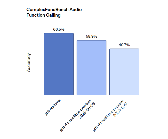 在衡量指令执行准确率的 MultiChallenge 音频基准测试中,该模型的gpt-realtime得分为 30.5%,相比 2024 年 12 月发布的上一版模型(得分为 20.6%)有了显著提升。