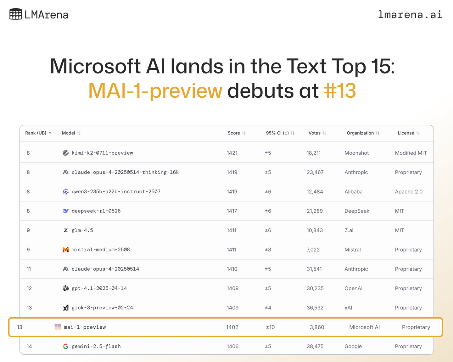 MAI-1-preview 已上线 LMArena 社区测试,排名第 13,并同步向受邀开发者提供 API 试用申请。未来几周将先面向部分 Copilot 文本场景灰度上线,以收集反馈并持续迭代。