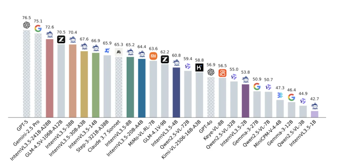 旗舰模型InternVL3.5-241B-A28B在多学科推理基准MMMU中获得开源模型最高分77.7分,多模态通用感知基准MMStar和OCRBench分别取得77.9分和90.7分,超越GPT-5(75.7分/80.7分),文本推理基准AIME25和MMLU-Pro分别达到75.6和81.3分,全面领先现有开源多模态大模型;