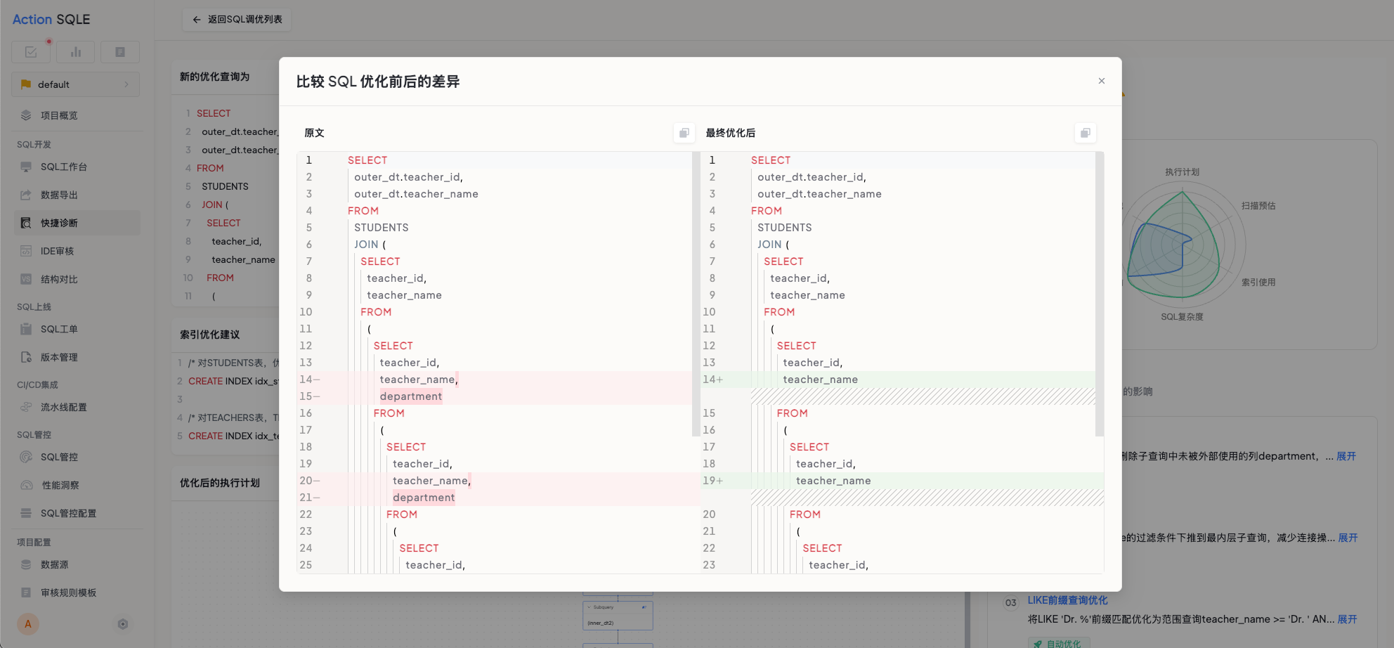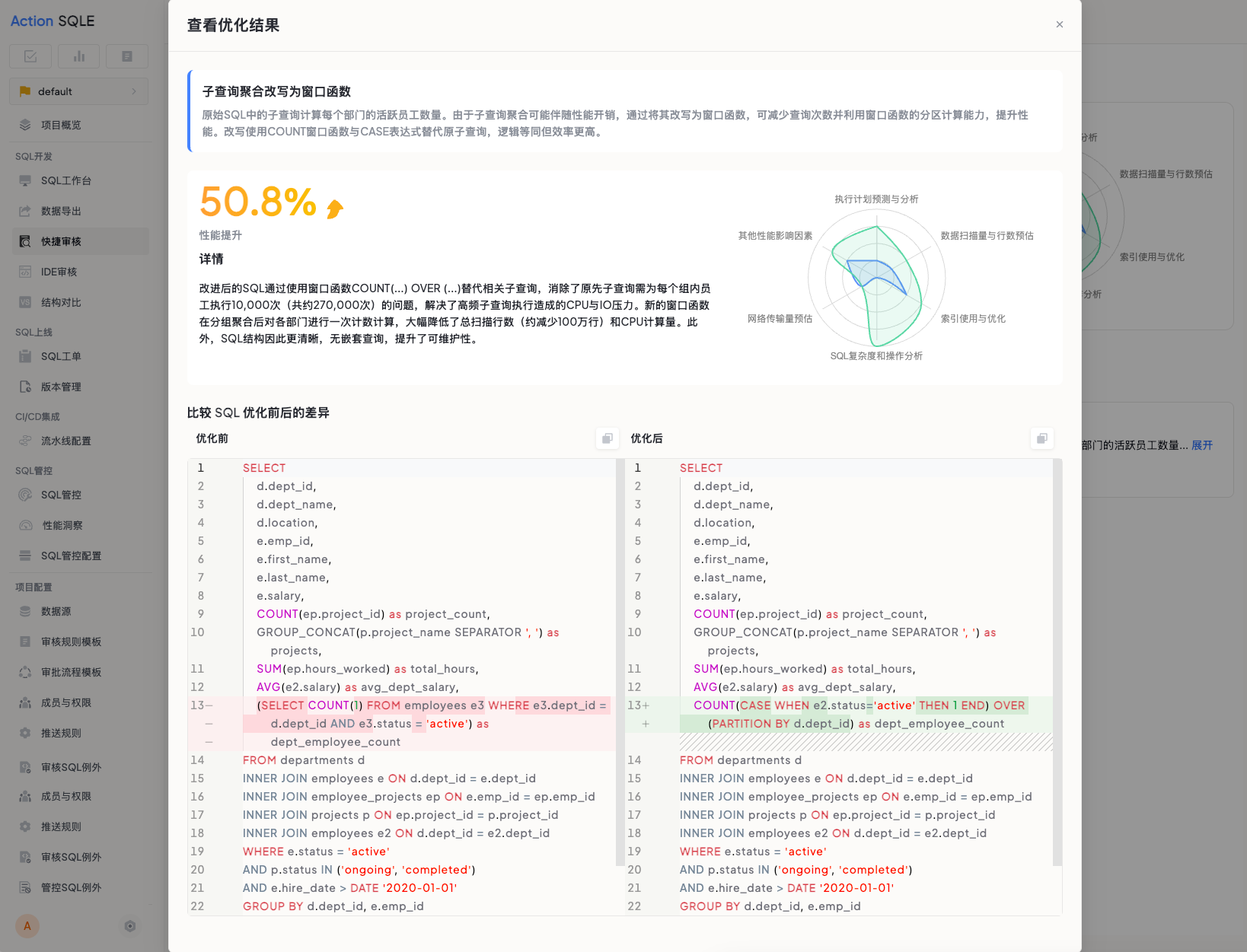 一键获得最优 SQL:你只需要把有问题的 SQL 交给我们,系统就会自动分析、诊断,并为你 “手写” 出一条性能更优的新 SQL。你只需复制、粘贴、执行,就能立即看到效果!