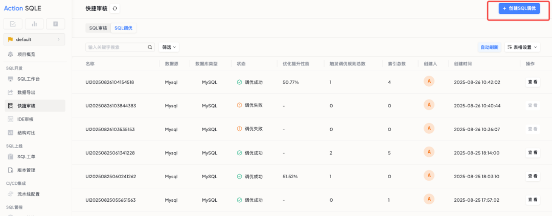 方法二:也可以从主菜单的【快捷操作】入口,主动创建一个调优任务,把你想优化的 SQL 粘贴进去就行。