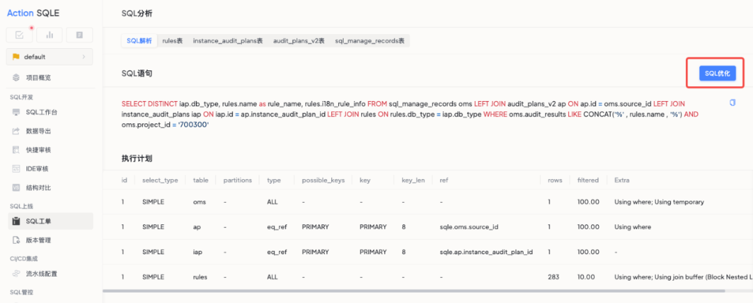 方法一:在 “SQL分析” 页面,如果发现有性能问题的 SQL,直接点击旁边的【SQL调优】按钮。