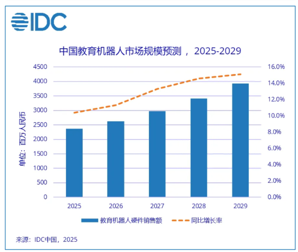国际数据公司(IDC)发布的最新数据,2025年上半年,中国教育机器人市场的硬件销售额达到了10.7亿元,同比增长12.5%。预计到2029年,市场硬件销售额将达到39.3亿元,五年复合增长率为12.9%。