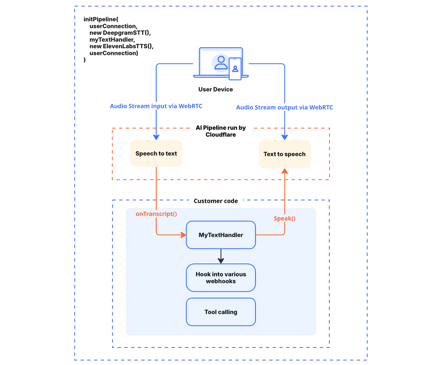 管道编排(如:Deepgram STT → 自定义文本处理 Handler → ElevenLabs TTS)