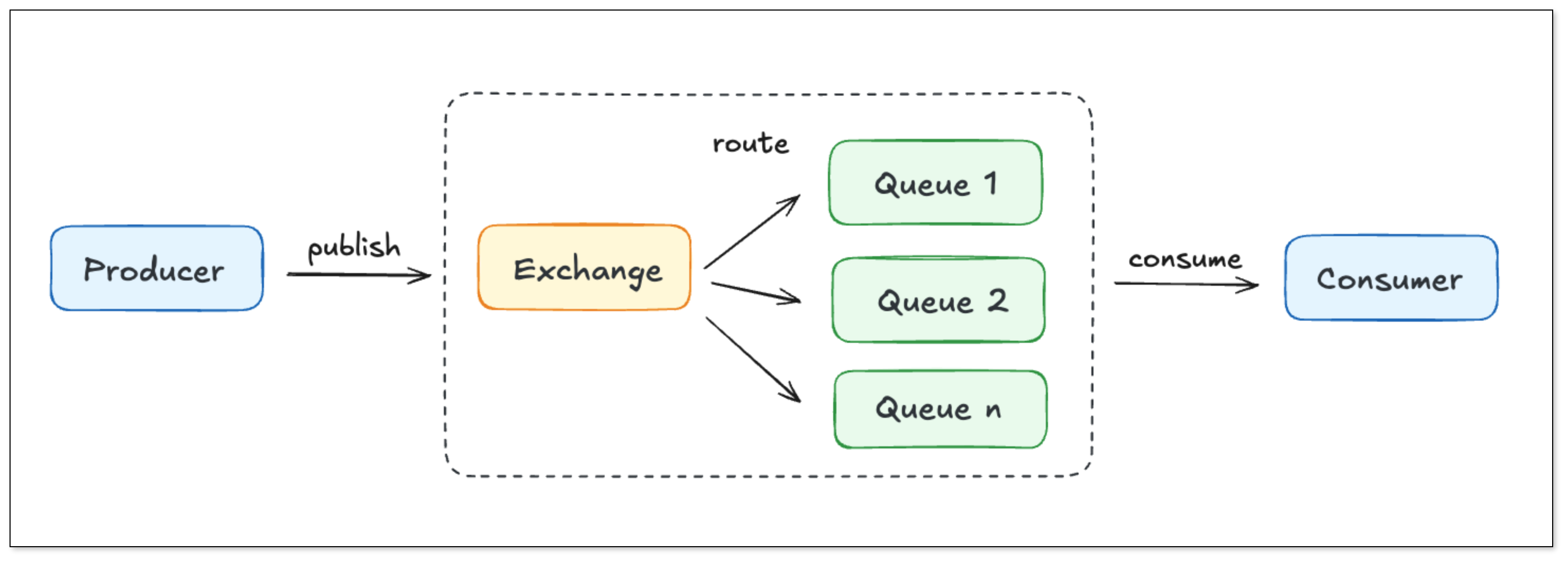 RabbitMQ 基于 AMQP 协议。Producer 将消息发送到 Exchange,再由 Exchange 根据路由规则将消息投递到不同 Queue,最终由 Consumer 消费。其路由模式(direct/topic/fanout/headers)非常灵活,便于应对复杂消息流转。