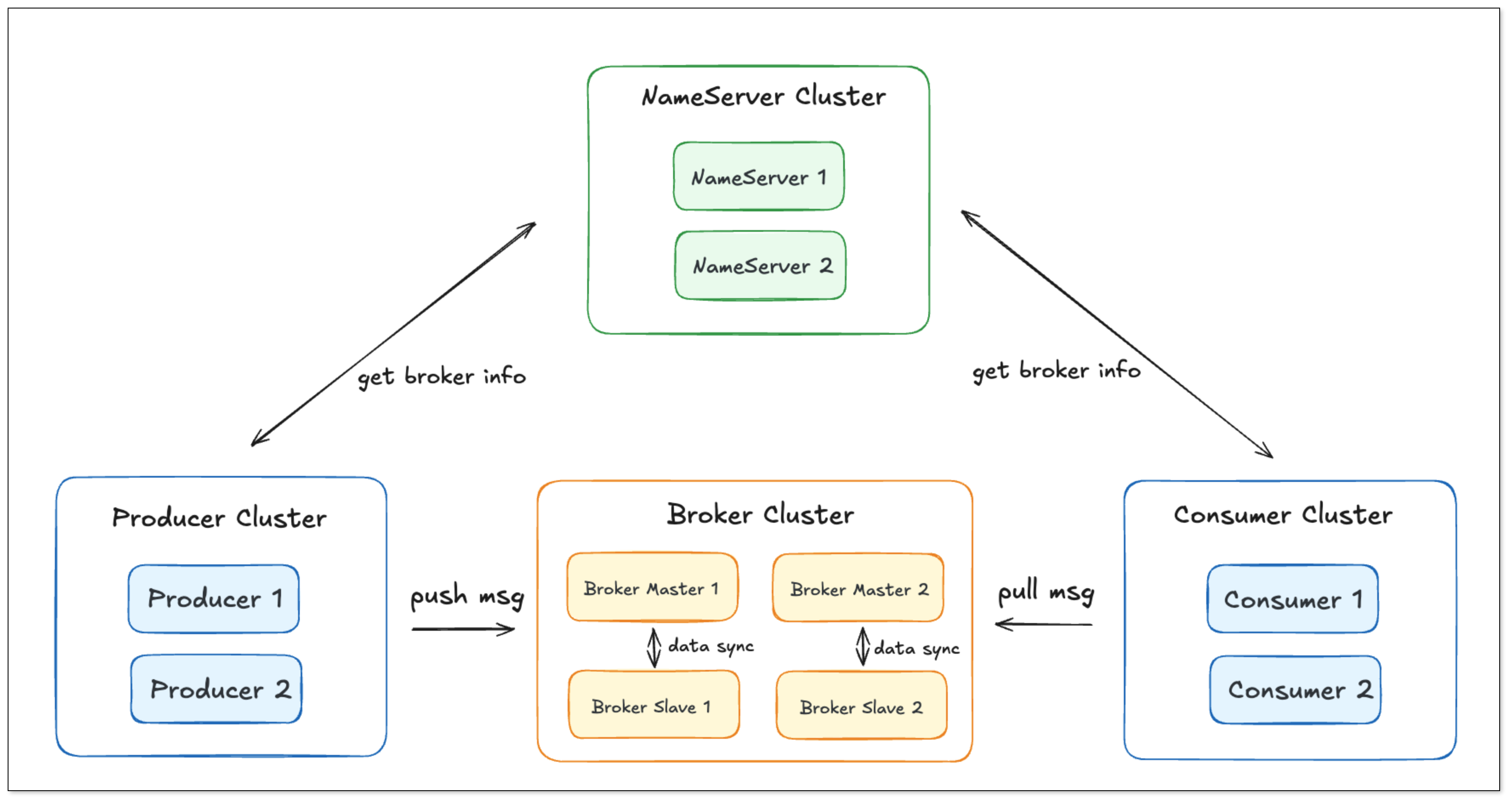RocketMQ 采用轻量级 NameServer + Broker 架构,Producer 从 NameServer 获取路由信息,再将消息写入 Broker 的队列(MessageQueue)。支持事务消息、顺序消息。