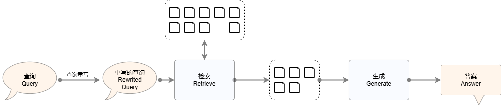 查询重写(Query Rewriting)是指对用户输入的查询进行一定程度的修改或优化,以提高检索结果的相关性和准确性。由于用户的查询可能存在表达不清、关键词缺失、语法错误或查询意图不明确的情况,直接使用原始查询进行检索可能会导致不完整或不相关的结果。因此,通过查询重写,可以调整查询内容,使其更符合系统的理解能力和检索机制,从而提升召回率。下图为使用查询重写机制的RAG流程。