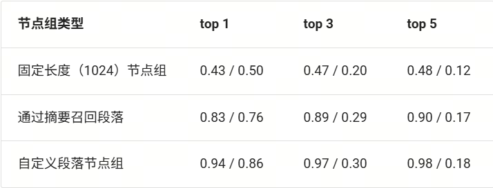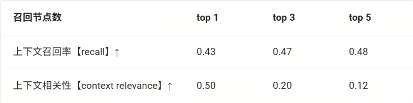 (使用不同节点组召回的结果对比:recall ↑ / context relevance ↑)