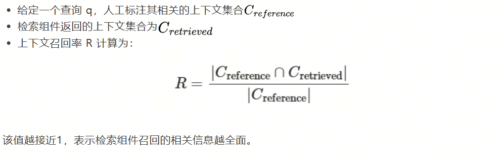 上下文召回率用于衡量检索组件是否能够从知识库中召回与查询相关的所有关键信息。具体计算方式如下: