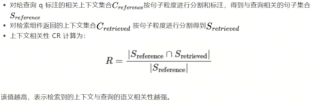 上下文相关性用于评估检索到的上下文中与查询语义匹配的句子比例。具体计算方式如下: