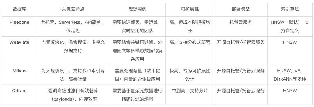 为了给技术选型提供一个实用的决策框架,下表对几个主流的向量数据库进行了比较。