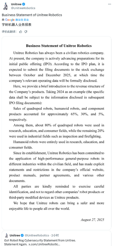 宇树科技在社交媒体上发帖称,预计将在2025年10月至12月期间向证券交易所提交上市申请文件,届时公司的相关运营数据将正式披露。