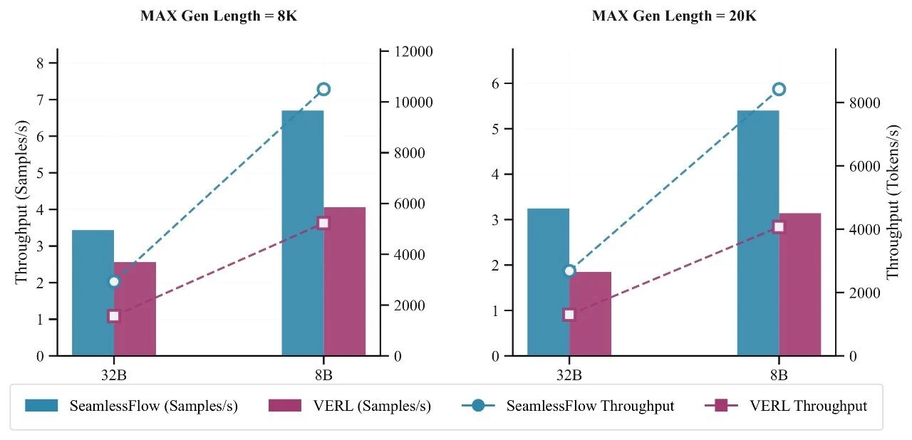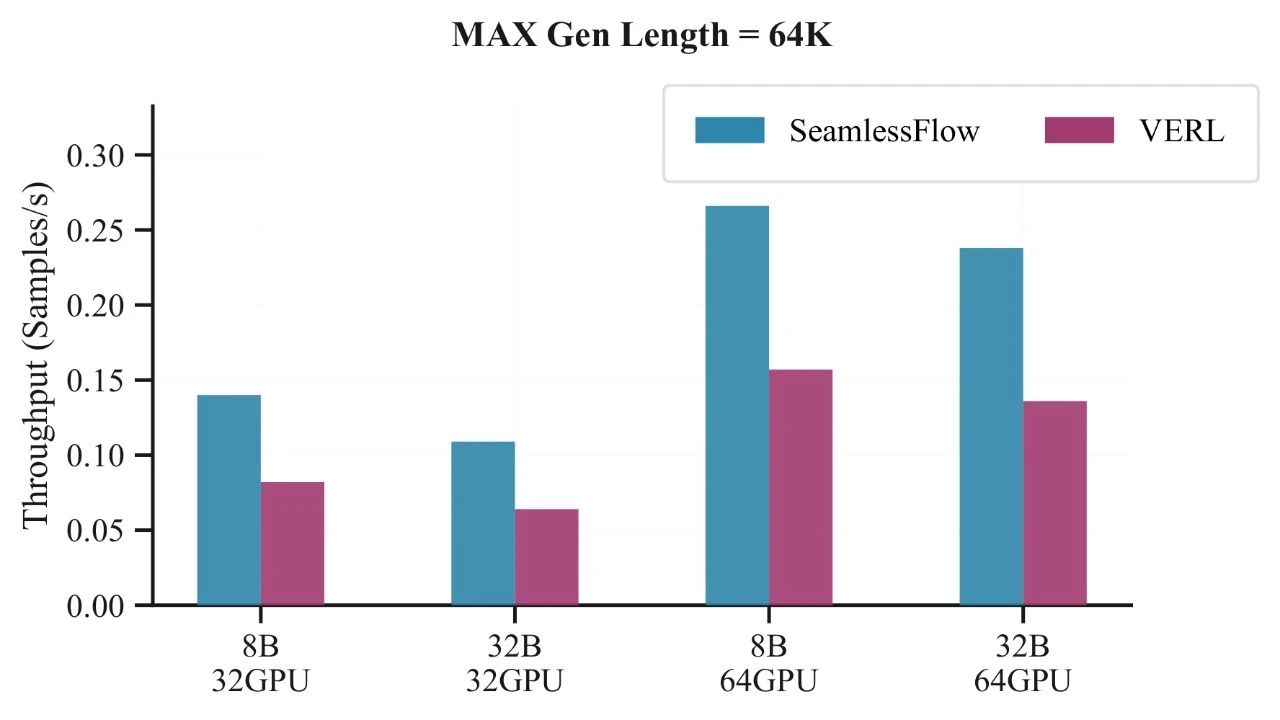 在实际测试中,SeamlessFlow的端到端token吞吐量相比基线提升100%,整体训练时间减少62%。