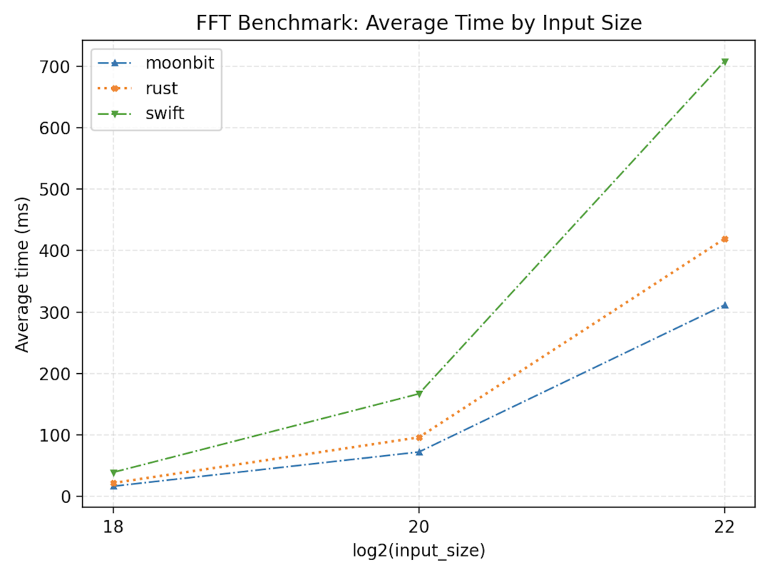 其中 x 轴下标表示 FFT 计算输入的数据量的对数,y 轴 FFT 函数计算的运行时间,通过 bench 的结果可以看到 MoonBit 在数值计算方面已经优于主流编程语言,其中相比 Rust 有 33% 的性能提升,相比 Swift 有 133% 的性能提升。