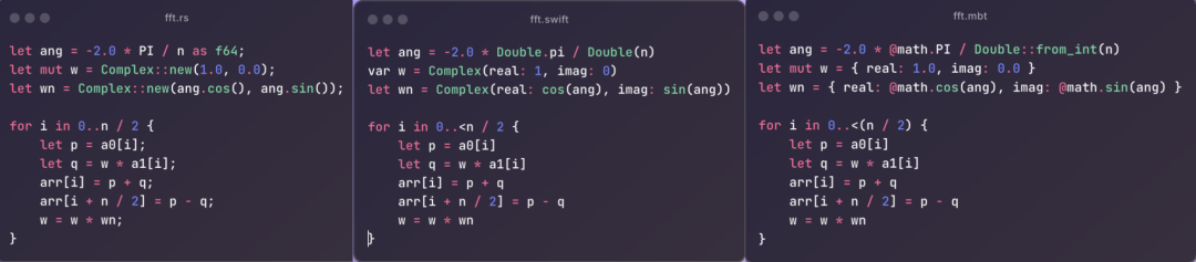 FFT 核心部分代码示例如下图所示,从左到右依次是 Rust,Swift 和 MoonBit,完整的 bench 代码可以在GitHub仓库: