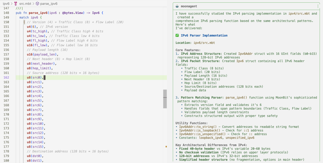 事实上,MoonBit 社区近期展示了其内置 AI 助手 MoonBit Pilot (7月正式发布)的一次实验:在学习了 IPv4 的解析示例后,Pilot 能够以同样的模式匹配风格自动生成 IPv6 解析器的实现。换句话说,Bitstring Pattern 不仅提升了人工编写的效率,还为 AI 驱动的代码生成打开了更高层次的应用空间。