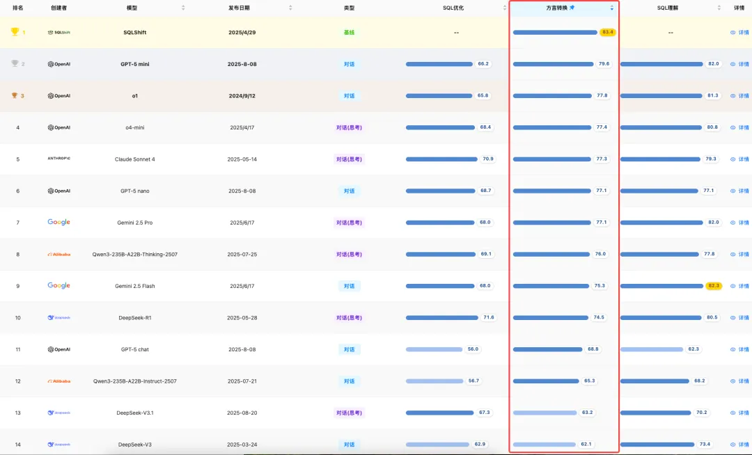 本月首次引入专用"方言转换应用" SQLShift 进行评测,其在核心领域展现了强大性能,开启了通用大模型与专业工具在特定场景下性能对决的序幕。