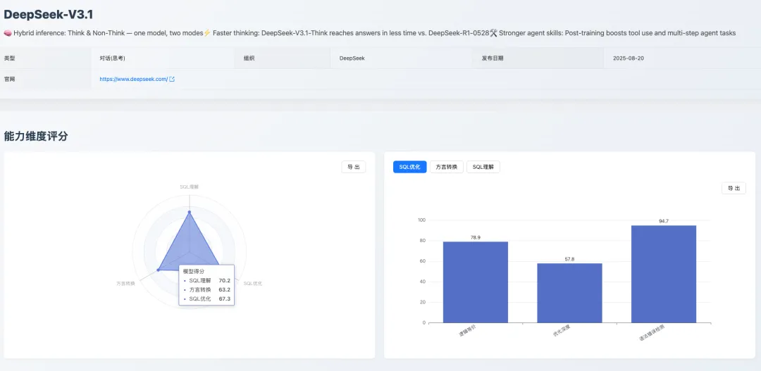 DeepSeek-V3.1 在 SQL 理解 、优化 和方言转换 三大维度上展现了较为均衡的实力,在特定场景如 国产数据库转换 中表现完美,但在处理超长复杂查询和深度优化方面仍有提升空间。