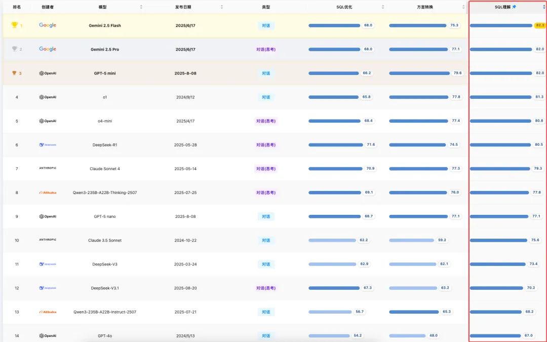 2025 年 8 月《大模型 SQL 能力排行榜》发布