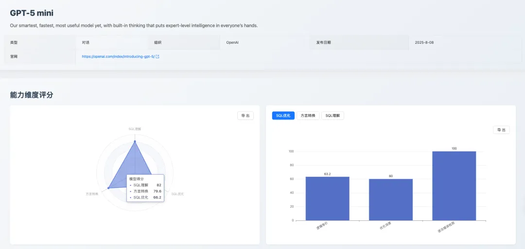 - 能力优势 :执行准确性高,可靠性强(SQL 理解 维度 82.0 分);基础能力扎实(方言转换 中的语法错误检测 92.9 分)。