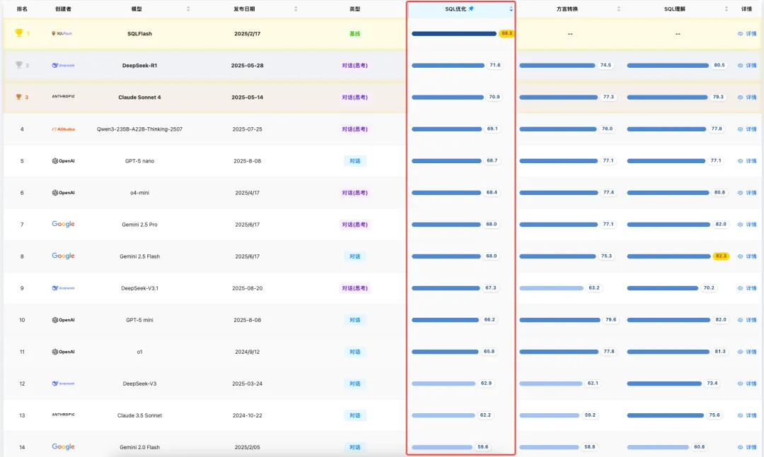 **简评:**专用优化模型 SQLFlash 以 88.5 分的显著高分继续保持该维度榜首,与其他模型拉开较大差距。新模型中,gpt-5-nano 以其在语法可靠性上的高分进入前五。评测结果显示,通用大模型在深度优化能力上与专用模型相比仍存在明显差距。