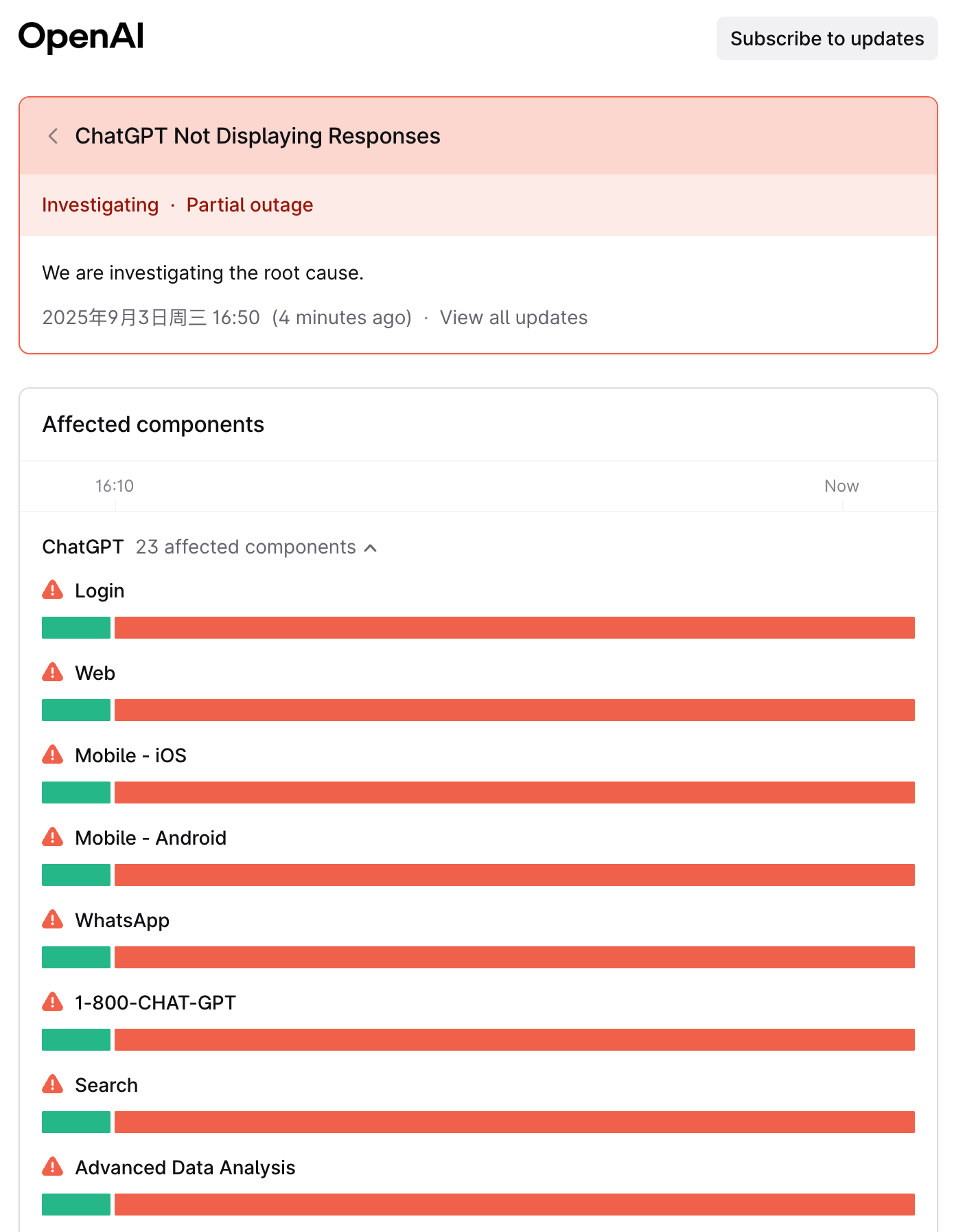 9月3日,根据OpenAI状态网站的最新更新,该公司正在调查ChatGPT无法显示回复的故障。