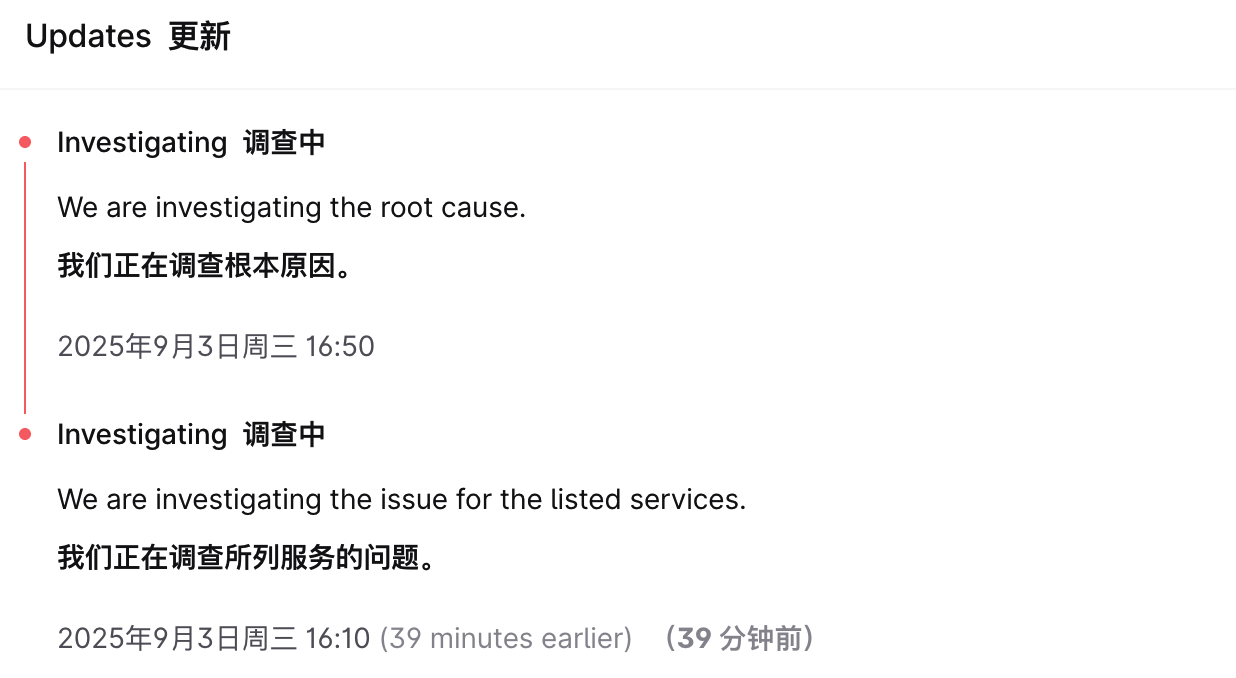 根据OpenAI状态网站的最新进度,他们正在调查故障的根本原因。