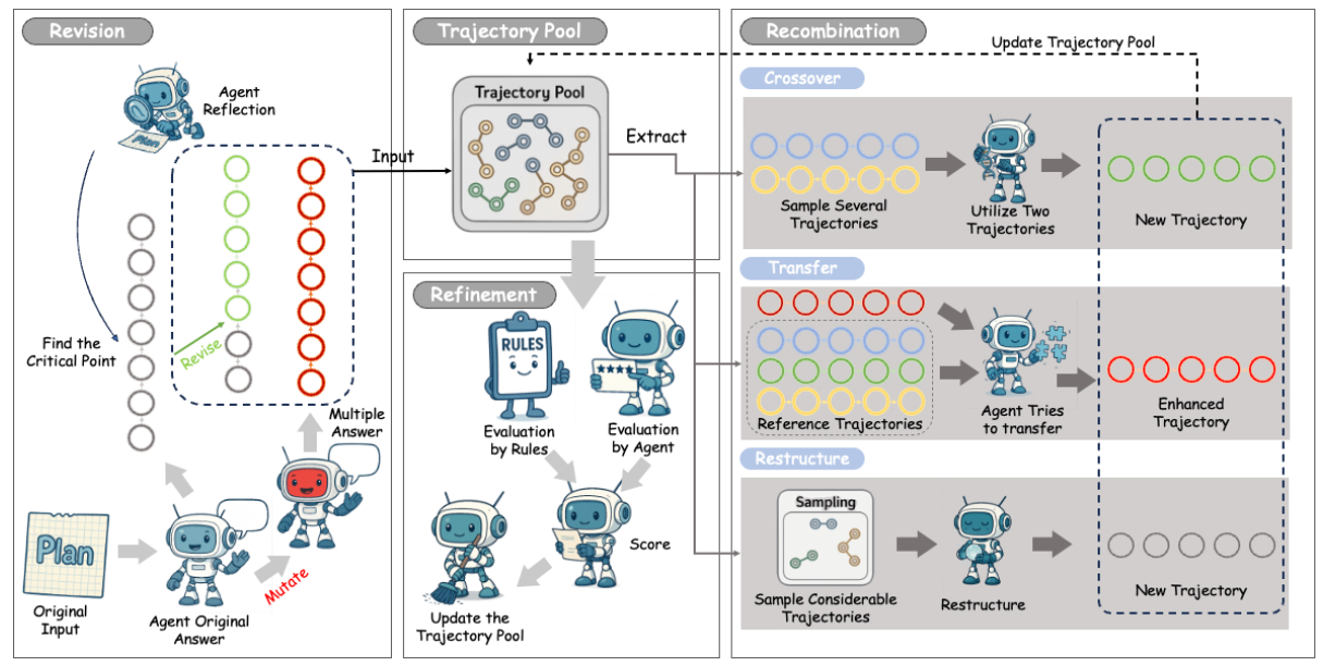 通过消除冗余,并利用来自整个轨迹池的洞察来提升效率,从而优化有前景的轨迹。新轨迹形成后,此步骤将进一步完善这些轨迹,包括移除不必要的步骤、精简行动顺序,并融入风险感知指导,从而避免从集体探索历史中汲取的系统性盲点和故障模式。