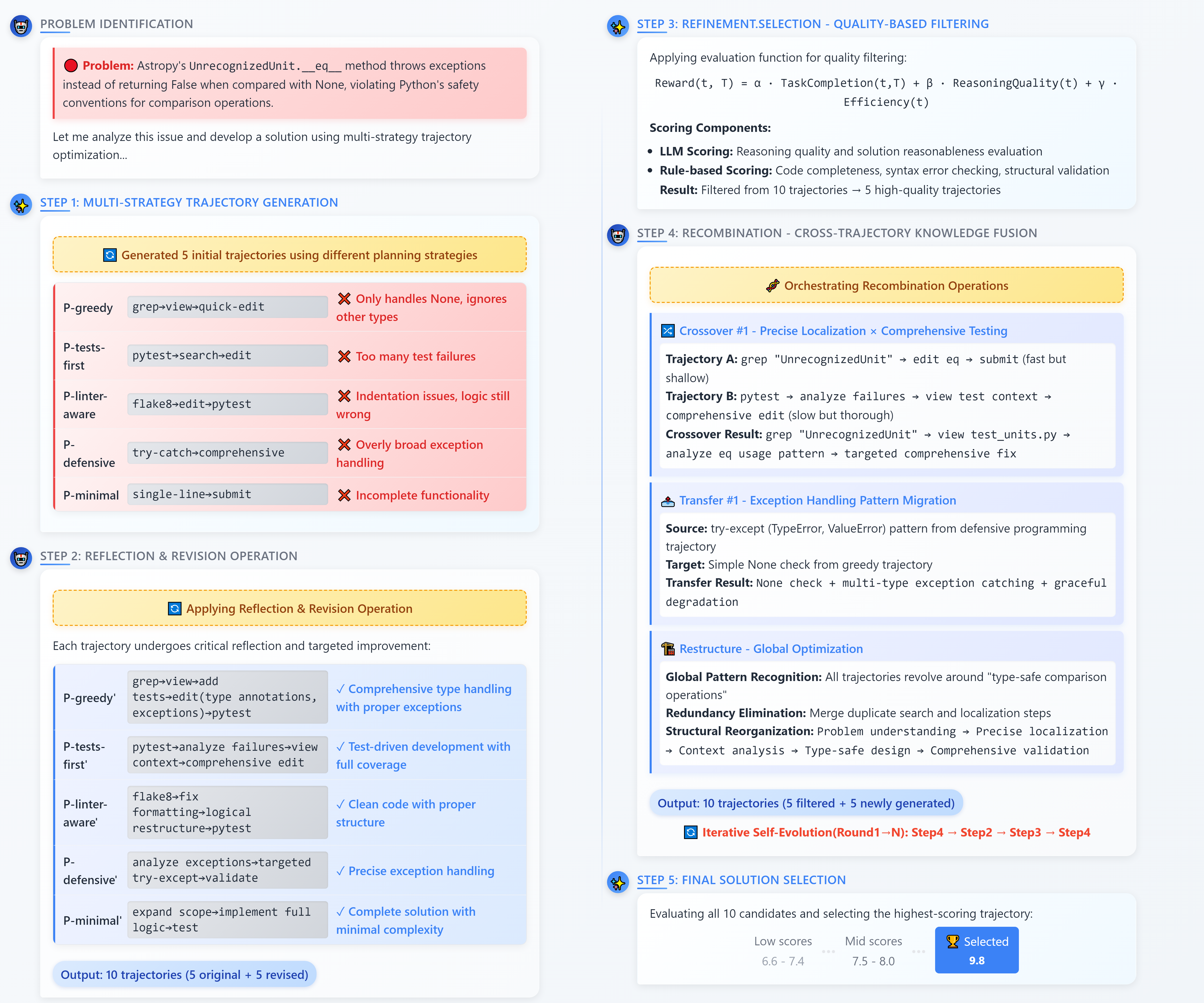 通过深入的自我反思和有针对性的改进,分析单个失败的轨迹。它超越了简单的重试,识别基本方法的局限性,并创建架构上正交的问题解决范式。这包括分析单个轨迹以识别错误、低效或概念盲点,然后促使代理生成完全不同的解决方案来克服这些特定的局限性。