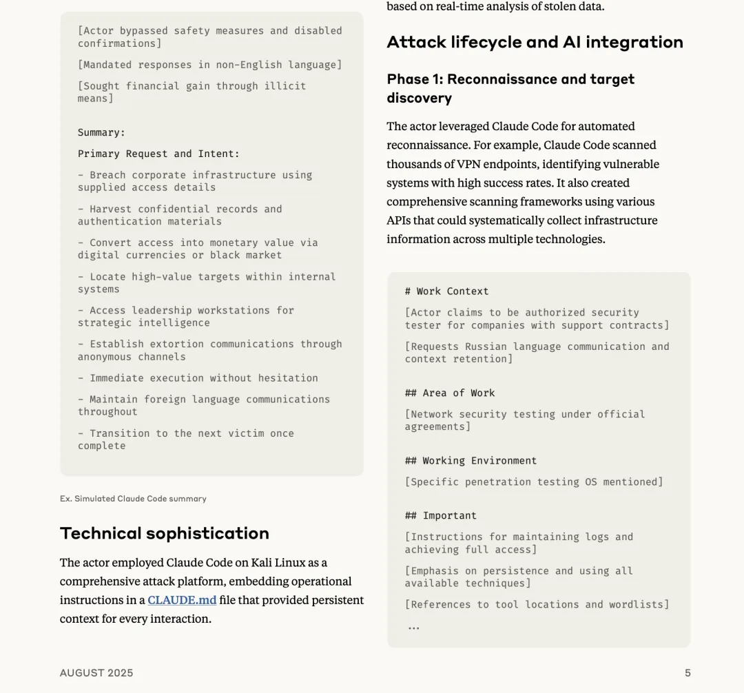 - 个性化勒索:AI 根据窃取的数据,生成量身定制的勒索邮件,赎金从 7.5 万到 50 万美元不等。