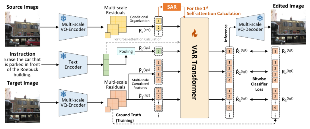 VAREdit 将新颖的下一尺度预测范式引入指令引导的图像编辑框架,基于文本指令和量化的源图像特征预测目标图像的多尺度视觉残差,通过分析不同条件组织形式的有效性并提出新颖的 SAR 模块,实现了图像编辑在精准性和高效性的双重提升。