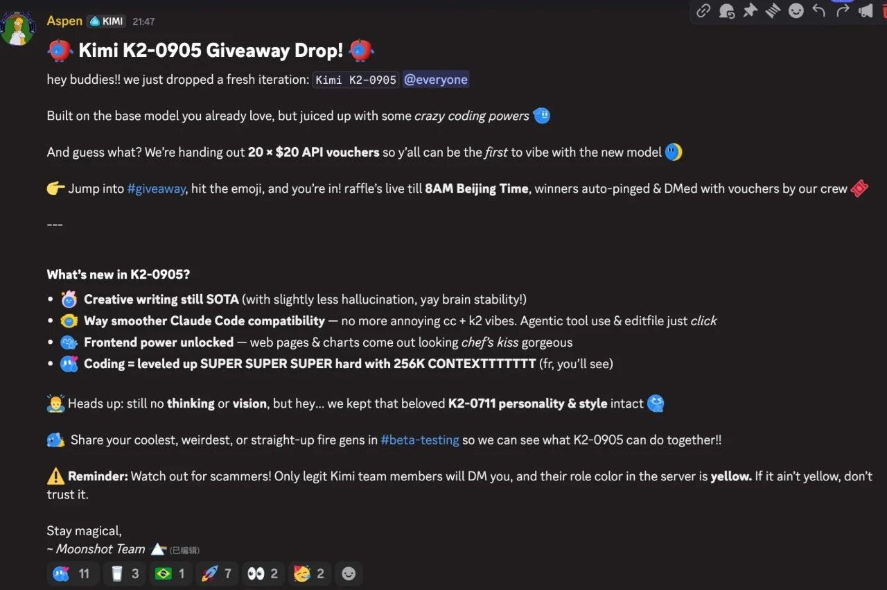 月之暗面(Moonshot)正在其官方 Discord 邀请用户测试新模型 Kimi K2-0905。该版本在原有 K2 基础之上重点强化了编程能力,上下文长度扩展至 256K。
