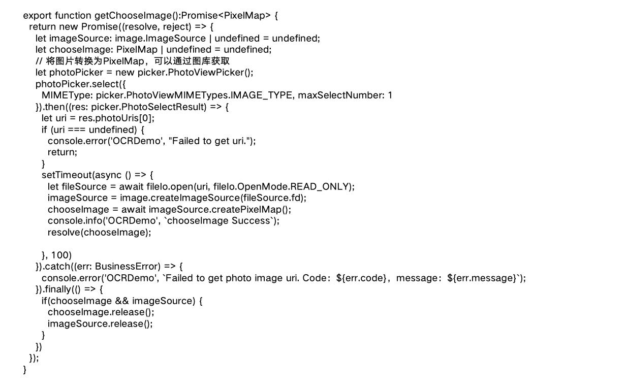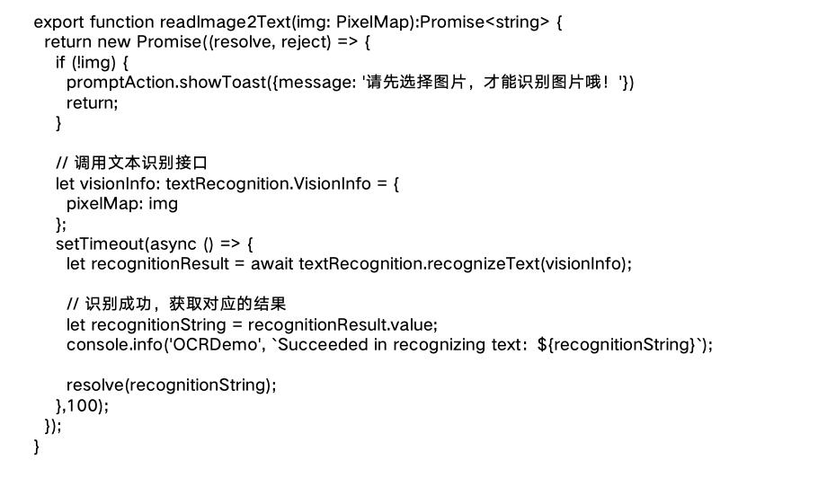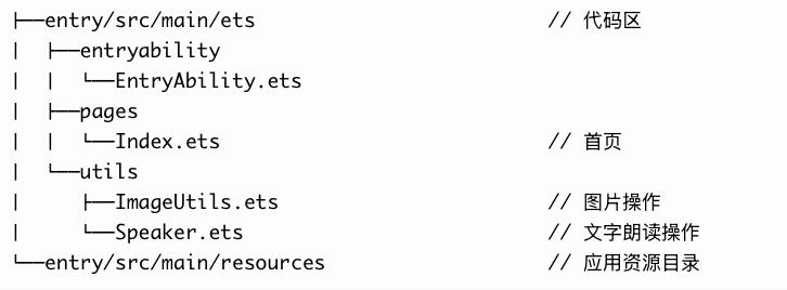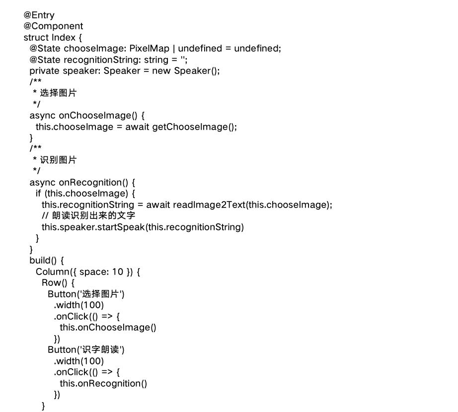 下面介绍一下如何实现识别图片文字,并朗读识别出来的文字,我习惯把逻辑功能放到单独的文件里,在界面上调用,这样UI和逻辑分开,从工程目录可以看出,Index.ets文件是负责UI的,ImageUtils.ets文件里包含两个funtion,一个是getChooseImage从图库选择图片并返回,一个是readImage2Text把参数图片里的文字识别出来并返回,Speaker.ets文件是文字转语音的逻辑,包含创建对象,调用播放、暂停接口。