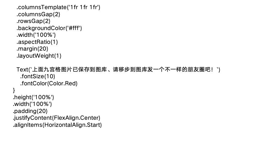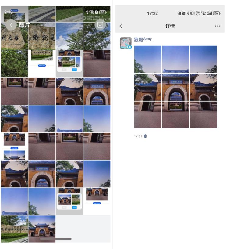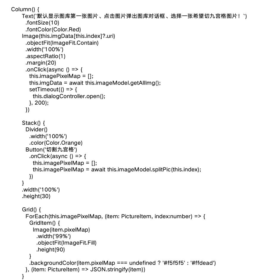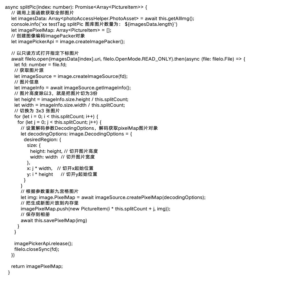 使用createImagePacker创建ImagePacker实例,然后使用fs.open打开文件,调用createImageSource接口创建图片源实例方便操作图片,接下来使用getImageInfo方法获取图片大小便于分割,最后使用createPixelMap方法传入每一份的尺寸参数完成图片裁剪。具体就是根据图片选择对话框,选择的下标,到图库里获取到选择的图片,然后以只读方式打开图片,获取打开图片信息,计算出切图后的宽度和高度,根据参数生成新切图,并缓存到数组里,方便显示切图后的九宫格,最后调用存储函数把切图存储到图库里,方便之后使用,比如发朋友图。