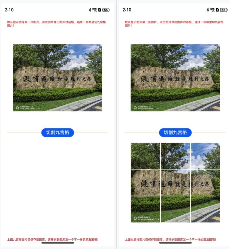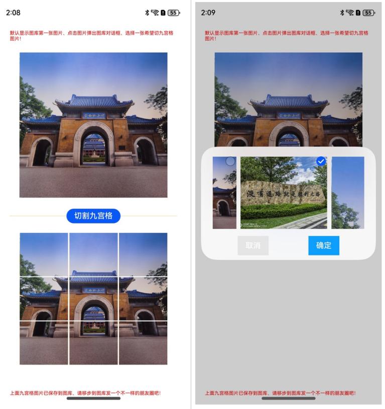 顶部和底部显示红色说明文字,上面默认显示图库第一张图上,点击图片弹出对话框选择图库里的其它图片,下来是个切割九宫格按钮,点击可以把选择的图片切割为九张图片,并自动保存到图库里。