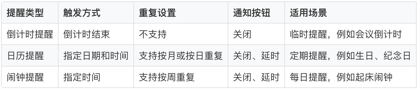 ·日历提醒:基于日历事件的提醒功能,例如在特定日期和时间提醒用户。