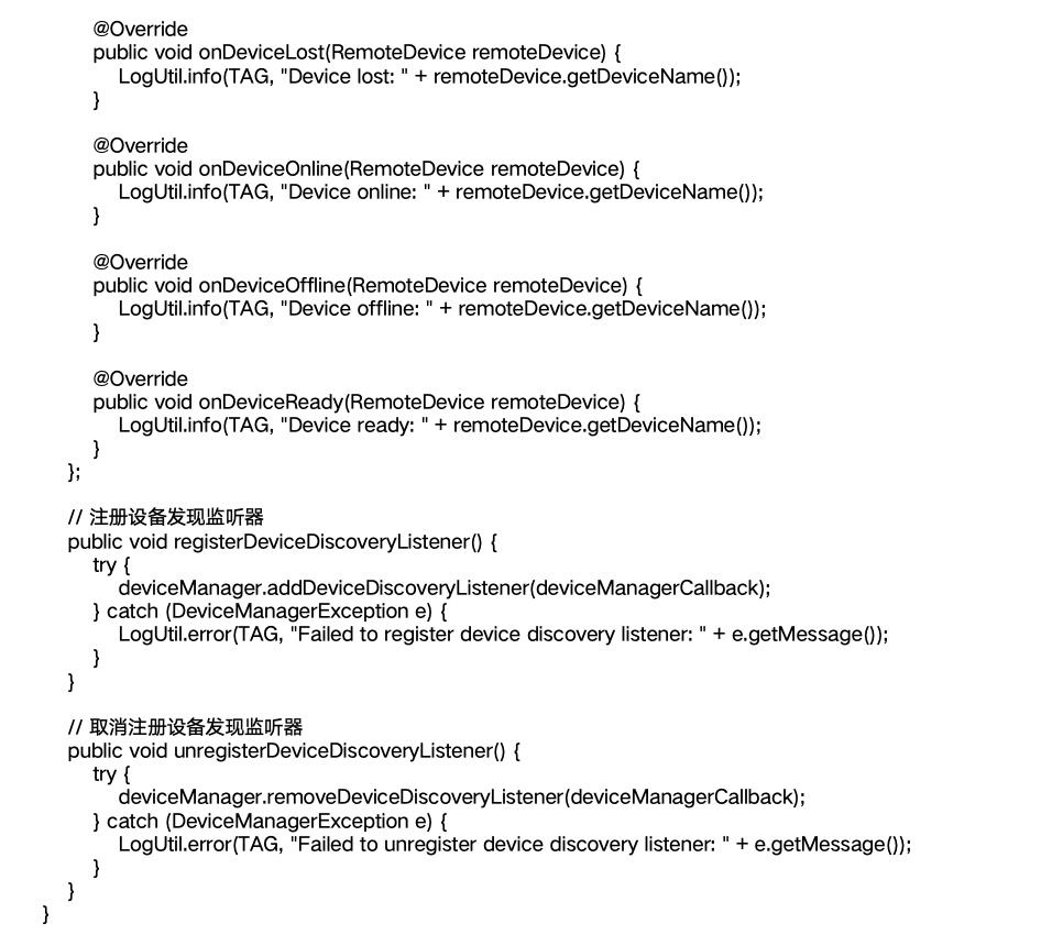 在上述代码中,我们首先获取了DeviceManager实例,然后通过它获取本地设备的信息,包括设备名称和NetworkId。接着,我们注册了设备发现监听器,当有新设备上线或设备状态发生变化时,会收到相应的回调通知。在实际应用中,我们可以根据设备发现的结果,选择目标设备并建立通信连接,实现数据的传输与同步。