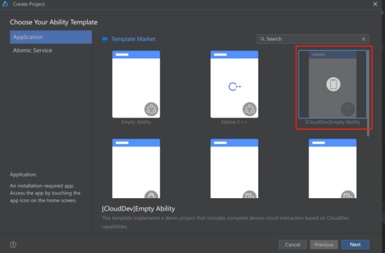 4.1 云函数开发是基于端云一体化项目开发,关于端云一体化项目创建,就是在创建项目时,选择下图模板就行,前提是要先在AGC上创建了项目和应用,这里就不介绍如何创建端云一体化项目,可以移步到官方文档查看。
