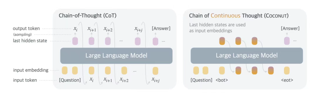 与上述所有方法形成有趣对照的是:词元空间究竟是否为模型推理的最优方式?现有研究开始探索让模型直接在隐空间[24]中推理 ------ 即在推理过程中将隐藏状态反馈给模型,而非解码后的词元。