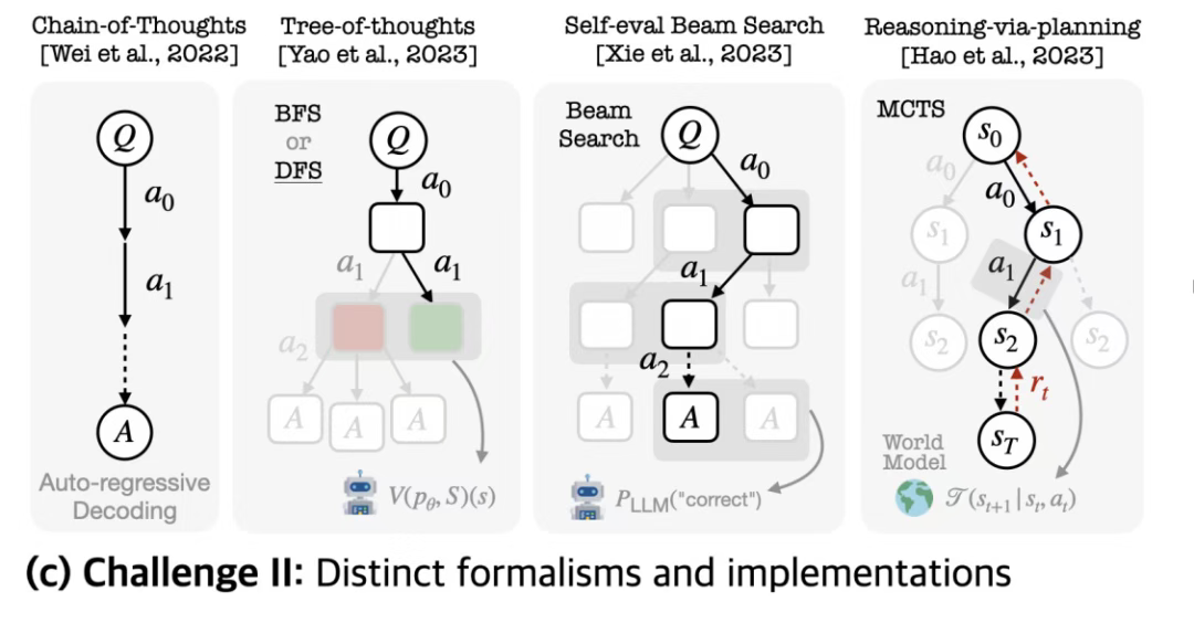 该领域的优秀研究案例包括:Tree of Thoughts[16]、Self-Evaluation Guided Beam Search for Reasoning[17] 以及 Reasoning with Language Model is Planning with World Model[18]。这些方法均融合了搜索技术(广度优先搜索、深度优先搜索、波束搜索、蒙特卡洛树搜索)与验证机制来引导语言模型推理生成。LLM Reasoners[19] 论文中的可视化呈现(如下图所示)直观展示了这些技术的运作方式。这些方法在核心思路上高度一致。