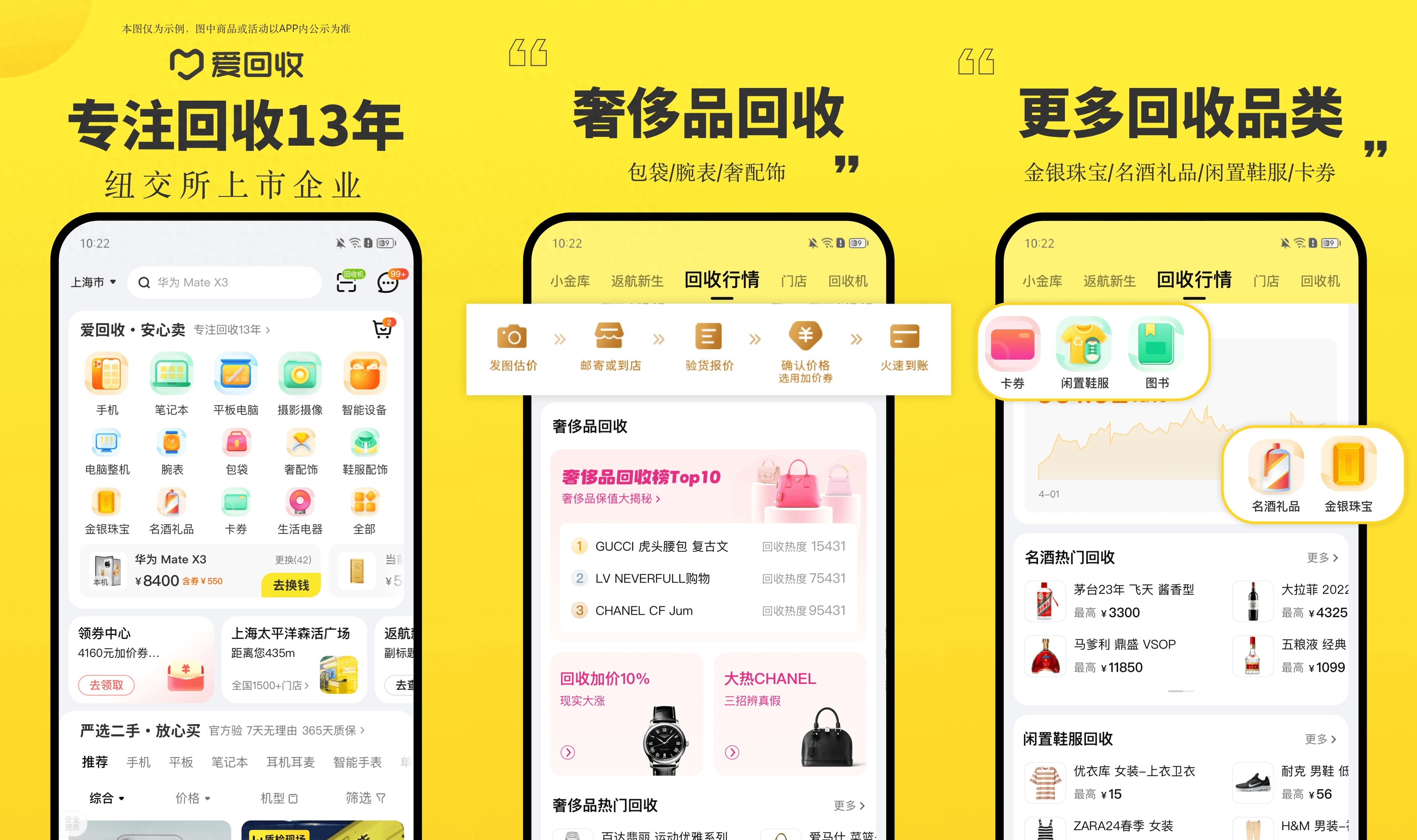 传统二手回收行业发展至一定阶段,必然开始面临回收渠道分散、线下产业链长、消费者缺乏信任等诸多难题。爱回收应运而生、抓住机遇,打通线上下单和线下回收交付渠道,逐渐发展成为涵盖手机数码、奢侈品、金银珠宝、潮鞋卡券等多品类的综合性回收服务平台。本着用户体验为先的原则,先后创新性上线了“本机估价”、“自动保存用户估价历史记录”等功能,一跃成为行业标杆类产品,仅2023年的3C类交易台数就达到3000多万。