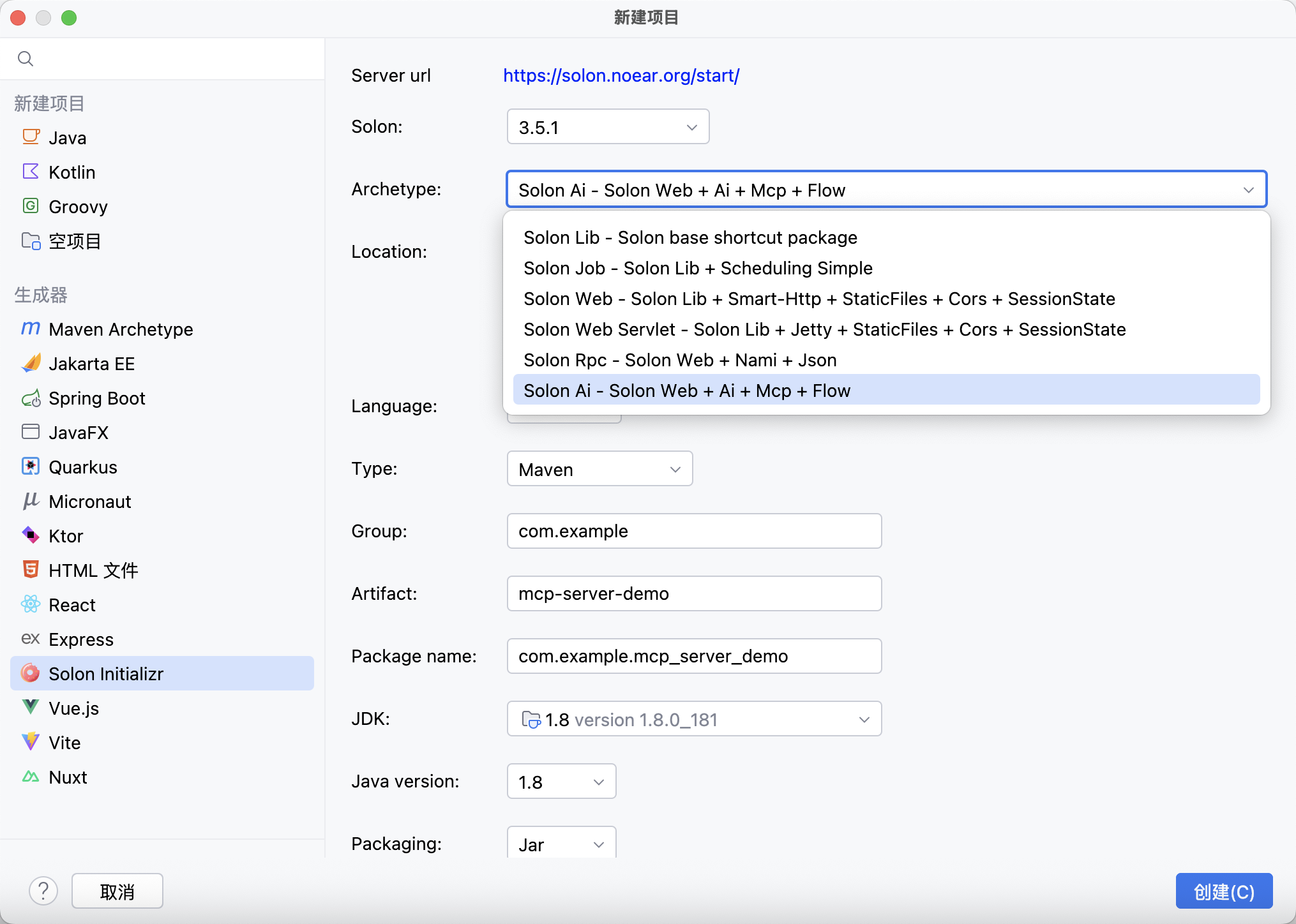创建时选择 Archetype 为 Solon AI(可以减少些活),会自动添加 Solon AI、MCP 相关依赖。