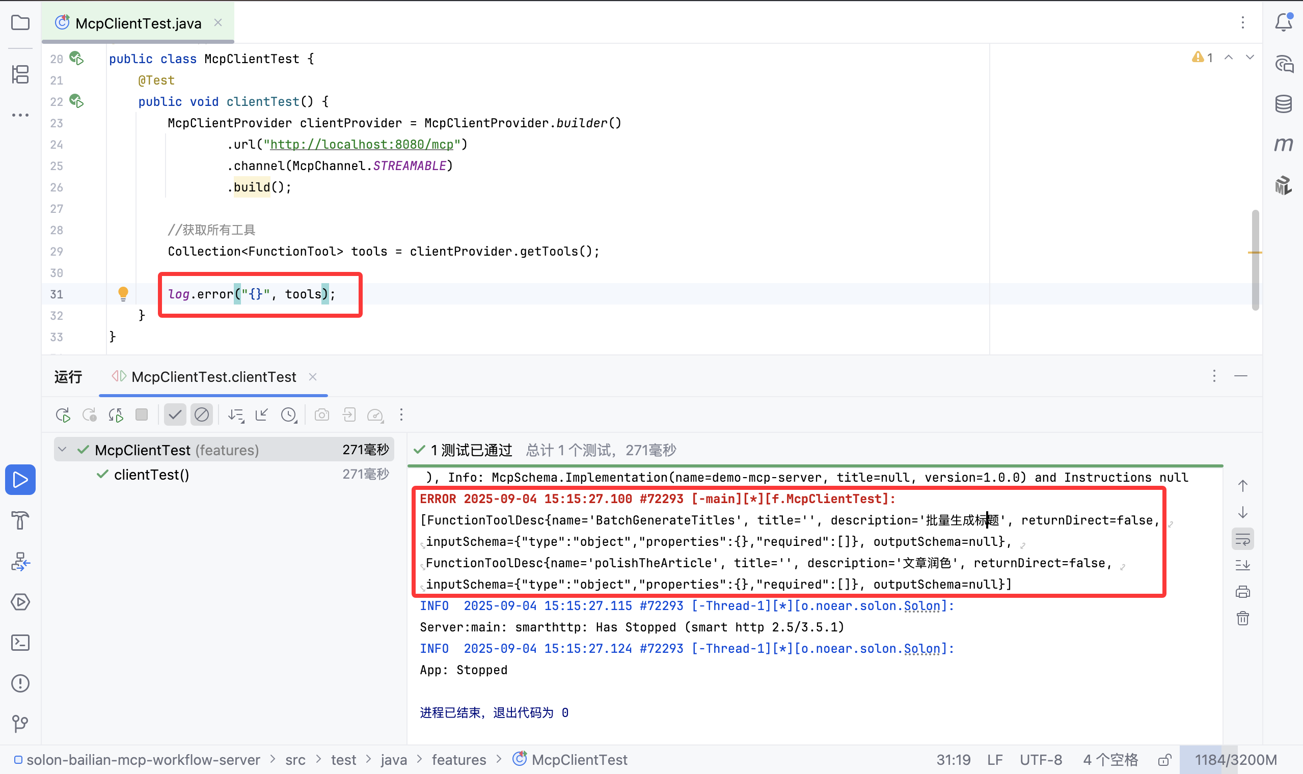 通过测试注解 @SolonTest(App.class) 启动服务端,通过 McpClientProvider 连接服务端并获取所有工具。