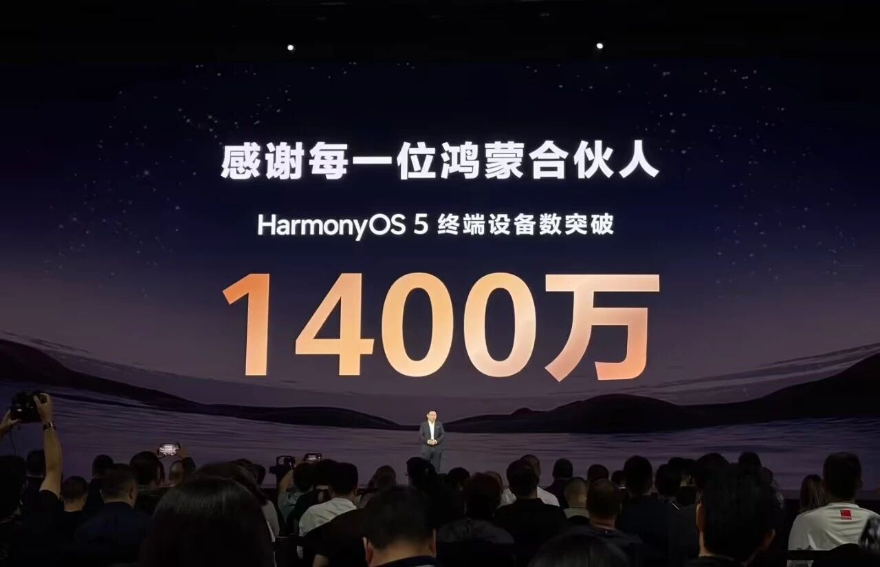 华为常务董事、终端 BG 董事长余承东宣布,搭载 HarmonyOS 5 的终端设备数量正式突破 1400 万。